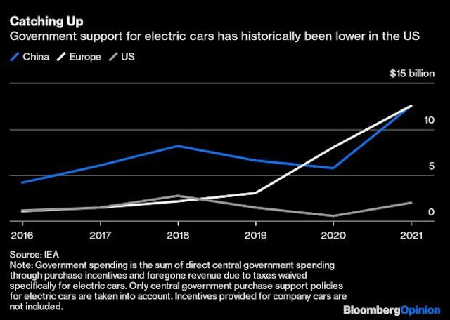 Will Ferrell’s 2021 Super Bowl ad for General Motors Co. makes bleak viewing today. The actor’s comic fury at being “out-EV’d” by Norway hit at a truth that was a point of pride for Europe: When it comes to electric-vehicle sales, the US has been a laggard, lacking the regulatory and investment push seen in China and Europe. “Don’t hate, imitate,” Volkswagen AG-owned rival Audi replied.