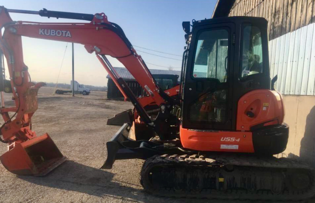 The tractor is described as a 2017 orange Kubota, mini-excavator, model U55-4.