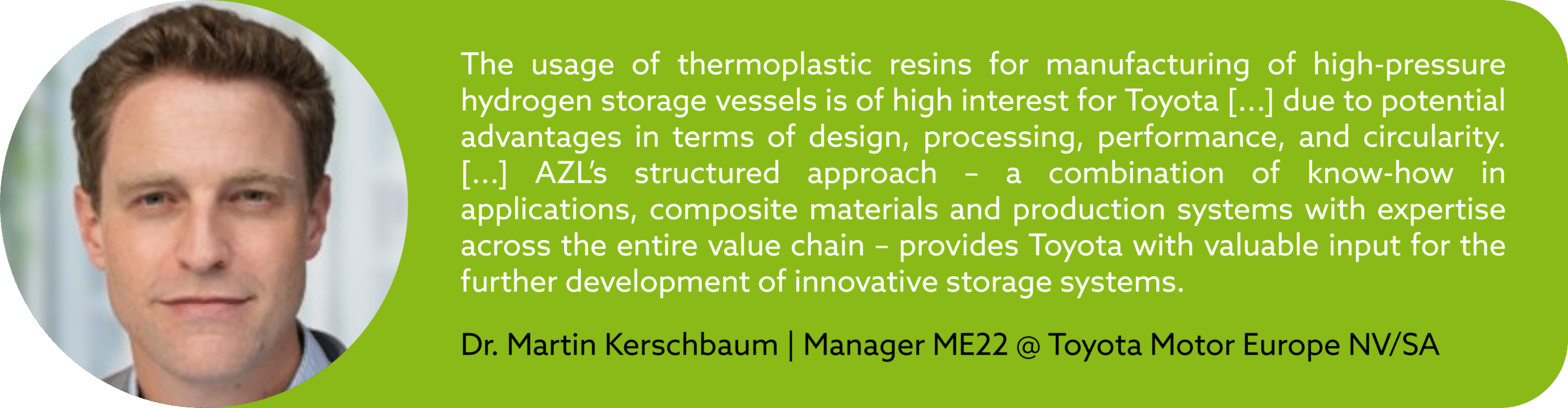 “The usage of thermoplastic resins for manufacturing of high-pressure hydrogen storage vessels is of high interest for Toyota. This is due to potential advantages in terms of design, processing, performance, and circularity. It is essential to compare and evaluate the diverse options of design and manufacturing strategies for high-pressure vessels based on thermoplastic composite materials. Gaining additional insights into the key influencing factors on material efficiency, production scalability and realistic cost-structure scenarios is a crucial part of this process. AZL’s structured approach – a combination of know-how in applications, composite materials and production systems with expertise across the entire value chain – provides Toyota with valuable input for the further development of innovative storage systems.”